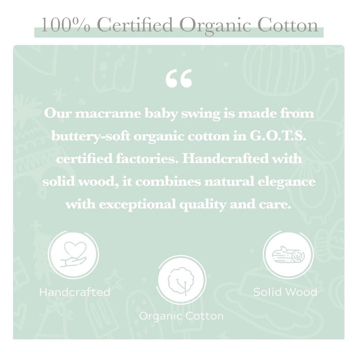 This swing combines artisan handcrafted quality with organic materials and a beautifully detailed boho design. It serves as both a functional, safe swing and a decorative piece that enhances any space, offering modern parents an eco-friendly and aesthetically refined choice for their little ones.