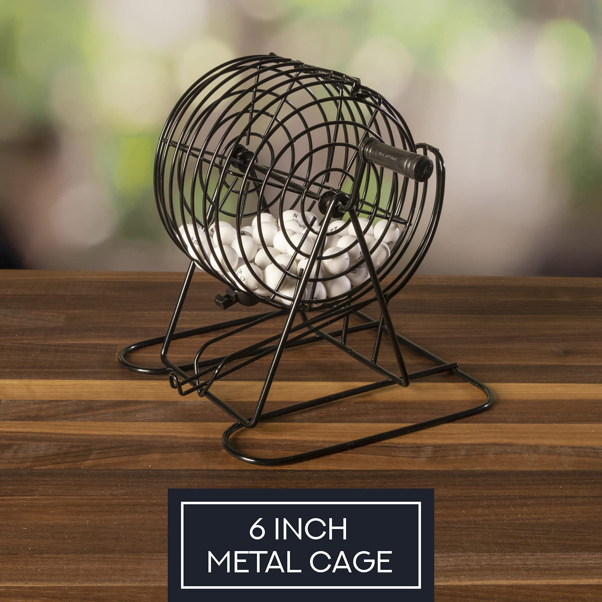 Everything you need is included to get started right away — a 6-inch metal cage, white Bingo balls, a masterboard, and four durable shutter cards for endless rounds of clean, family-friendly fun.