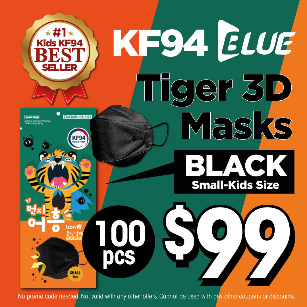 Blue KF94 Tiger 3D Mask (Small Black - Kid Size) - 100pcs Special