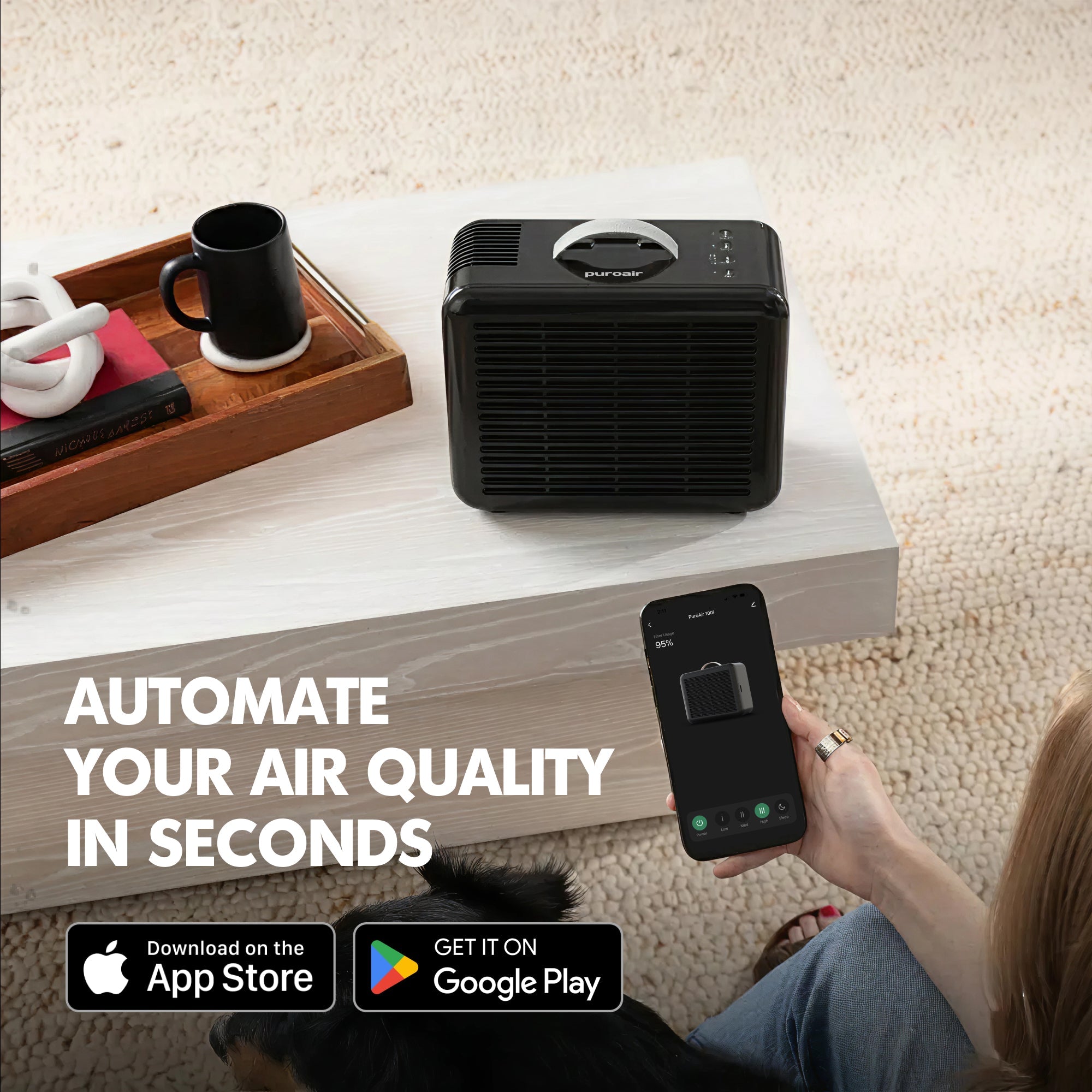 Enhancing its performance, the PuroAir 100i delivers modern convenience with built‑in smart features. Connect the purifier to the PuroAir App via Wi‑Fi to monitor and control settings from anywhere, or pair it with Amazon Alexa and Google Assistant for effortless voice commands. To keep your air at its best, the 100i also sends filter notifications, ensuring clean, healthy air at all times.